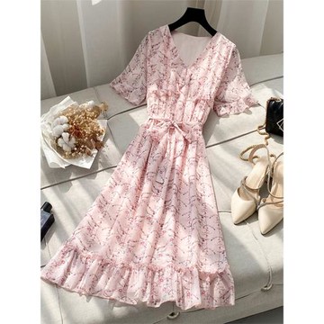 溫柔風碎花綁帶連衣裙夏季新款氣質中長款V領收腰顯瘦長裙