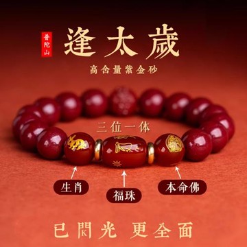 原礦硃砂手鍊 開光十二生肖三合手鍊 高含量紫金砂朱砂手鍊手串 2026生肖馬年吸財招財手鍊 (8-10mm)