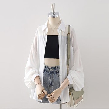 白色燈籠袖垂墜感半透夏薄款防曬衫女氣質休閑單口袋外穿開衫上衣