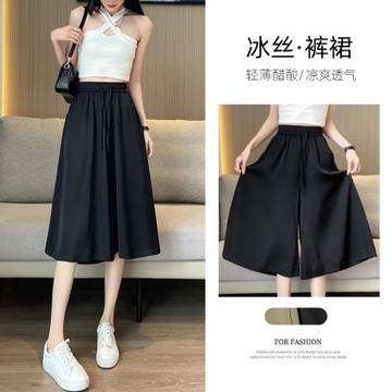 2025冰絲新款緞面褲裙女夏季薄款高腰垂寬松A字型遮肉顯瘦闊腿褲