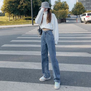 YoungGirlDay歐美街拍泫雅錯腰寬松顯瘦直筒闊腿老爹牛仔長褲
