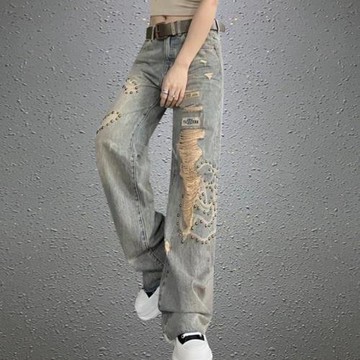 高腰牛仔褲女2026春新款重工釘珠鏤空磨破時尚顯瘦百搭拖地闊腳褲