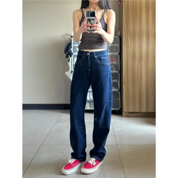 2025春秋新款女褲子藍色百搭牛仔褲寬松直筒闊腿高腰顯瘦拖地褲子