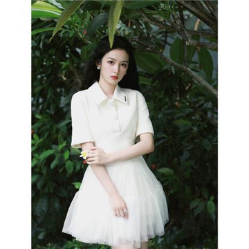 周也明星同款白色短袖連衣裙2025夏季新款設計感小眾