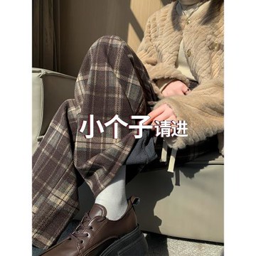 小個子褲子150撞色復古格子闊腿褲女秋冬慵懶風加絨美拉德直筒褲
