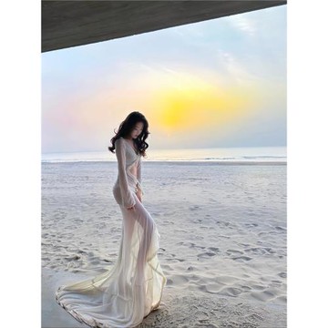 點我下載1R STUDIO 純欲風鏤空褶皺網紗鏤空連衣裙半透罩衫超仙海島度假裙