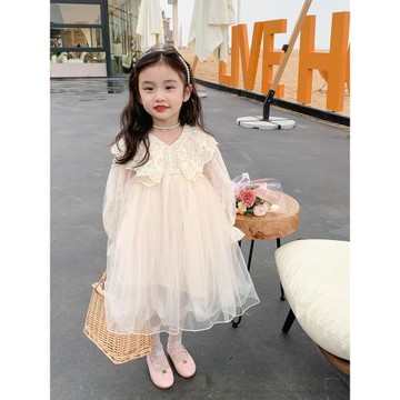 女小童網紅超仙釘珍珠長袖公主裙2023春秋新款蕾絲領蓬蓬網紗裙子