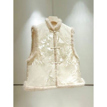 真絲刺繡夾棉新中式馬甲女2025新款國風立領拼貂毛無袖冬季外套
