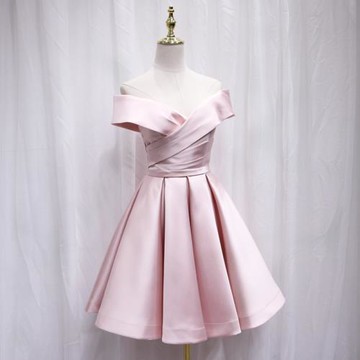 緞面一字肩粉色伴娘服姐妹裙顯瘦年宴會生日派對畢業成人禮晚禮服