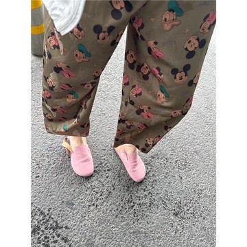 韓國東大門夏季新款軍綠可愛大頭米奇滿印設計感減齡直筒休閑褲女