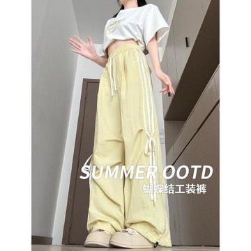黃色速干工裝褲女夏季2024新款高腰闊腿褲顯瘦直筒條紋蝴蝶結褲子