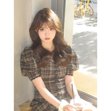 假兩件翻領復古格紋泡泡袖連衣裙女春夏新款小個子收腰別致短裙子