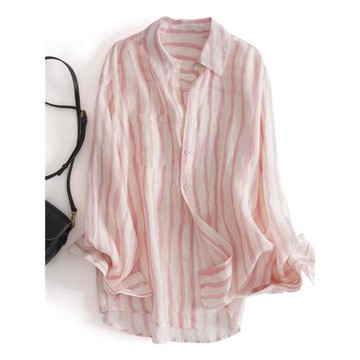 年中皆宜條紋織紋亞麻襯衫 亞麻襯衫 粉色*淺褐色 240924-2
