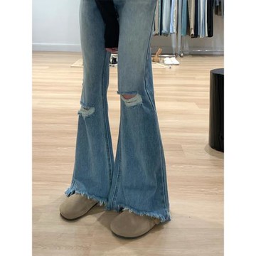 破洞毛邊微喇牛仔褲女秋季新款胖mm顯瘦大碼不貼腿小個子喇叭褲子