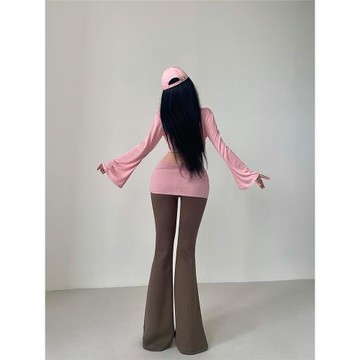 YoungGirlDay辣妹時髦撞色高腰彈力修身顯腿長喇叭休閑褲拖地長褲