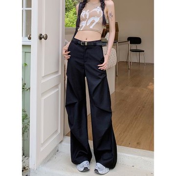 MYFC黑色高街褶皺西裝褲女夏季新款寬松顯瘦闊腿微喇叭拖地休閑褲