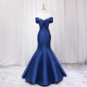 緞面一字肩魚尾晚禮服藍色修身包臀學生藝考美聲演出畢業舞會走秀