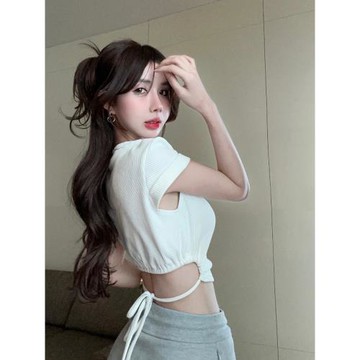 純欲甜辣妹性感露背短款上衣女夏設計感小眾露腰綁帶正肩短袖t恤