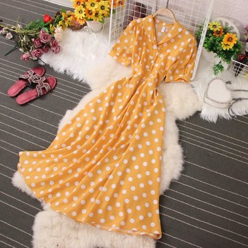 點我下載2022夏新款韓版V領短袖收腰系帶顯瘦單排扣雪紡溫柔風波點連衣裙