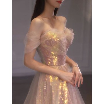 法式晚禮服女宴會氣質輕奢小眾高級感學生日粉色亮片成人禮一字肩