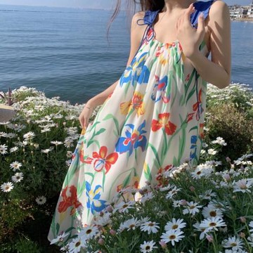 孫怡明星同款浪漫吊帶海邊長裙夏季印花連衣裙海島度假拍照沙灘裙