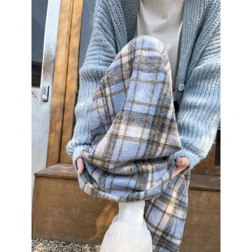 藍色毛呢格子褲子女秋冬季加絨2025新款直筒休閑慵懶小個子闊腿褲