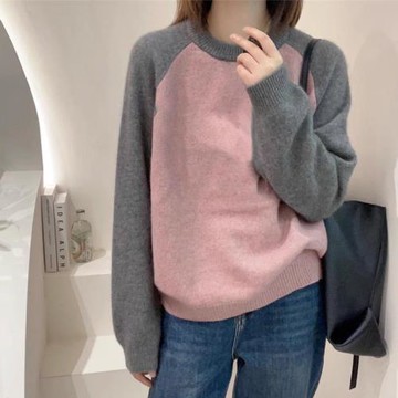 品牌折扣意大利剪標余單撿漏外單圓領拼色羊絨衫長袖針織打底上衣