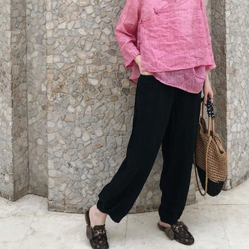 2025春夏新女 日系韓版大碼復古棉麻亞麻寬松顯瘦闊腿褲長褲