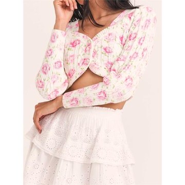 for love甜美減齡撞色扎染印花長袖針織開衫修身短款單排扣上衣女
