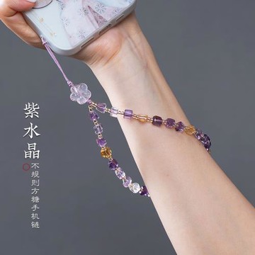 天然紫水晶方糖手機鏈繩掛手腕精致女掛飾夢幻黃水晶手機掛繩串珠
