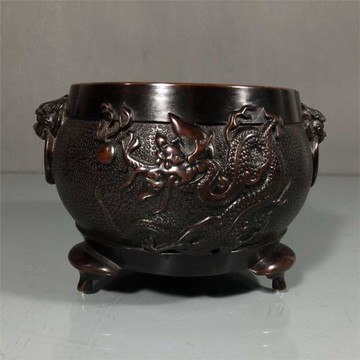 老件紫銅浮雕宣德款高12*26*17公分5.2公斤雙龍戲珠香爐擺件