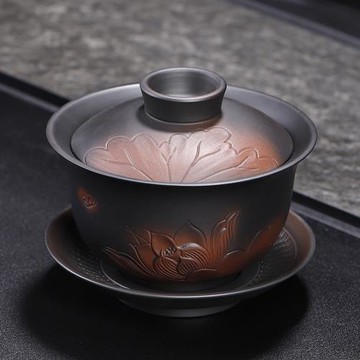 紫陶三才蓋碗家用復古純手工大號高端單個功夫茶具茶杯跳刀泡茶碗