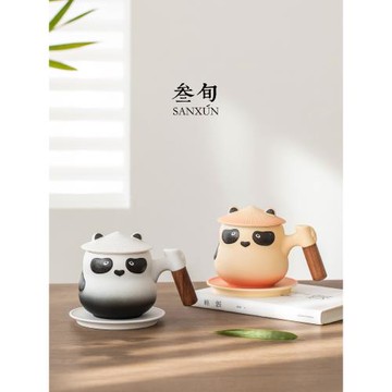 叁旬熊貓泡茶馬克杯創意陶瓷茶水分離杯子帶蓋男女辦公室過濾水杯