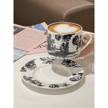 點我下載中式ins黑色調伊甸園咖啡杯碟高級花茶陶瓷杯碟 手繪玫瑰花早餐杯