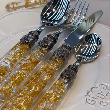 法式不銹鋼鏡面 復古西式餐具五件組 刀 + 叉 + 湯匙 + 小叉 + 小湯匙 大理石粉 1組