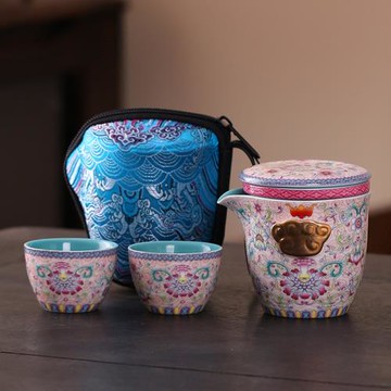 琺瑯彩便攜式旅行茶具帶包個人一人用陶瓷快客杯套裝戶外一壺二杯