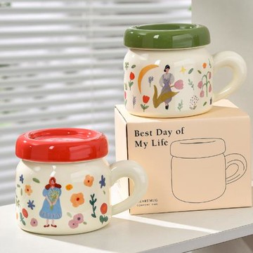杯子家用喝水杯辦公室宿舍ins簡約清新花草女孩陶瓷杯帶蓋馬克杯