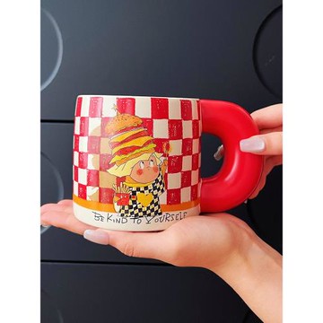 棋盤格咖啡杯 ins風陶瓷杯 復古拉花杯 現代馬克杯簡約茶杯 300ml