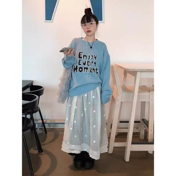 韓國chic春季新款小眾設計感立體鉤花拼接木耳邊顯瘦A字半身裙女