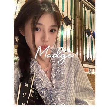 南法氛圍S.andro Madge法式藍色木耳邊條紋V領襯衫女2025早秋上衣