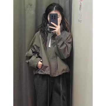 474894 春季女裝防風立領茄克連帽短外套 戶外簡約百搭純色夾克