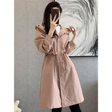 粉色風衣女中長款2025春秋新款韓版寬松大碼氣質收腰顯瘦連帽外套
