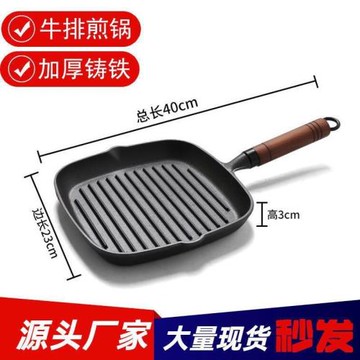 加厚鑄鐵條紋木柄牛排煎鍋牛扒煎盤24cm方形平底鍋無涂層一件代發