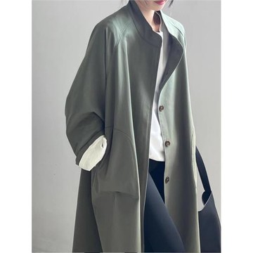 日韓外貿尾貨品牌剪標復古英倫風苔蘚綠立領翻領單排扣風衣外套女