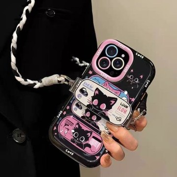 愛心黑色貓咪適用iphone16promax手機殼新款蘋果14可愛卡通女款15pro全包防摔保護套13創意12網紅女款帶手繩