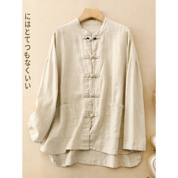 【米蘭精品】現貨+預購 新中式罩衫棉麻襯衫手工亞麻上衣夏季女裝大尺碼-長袖小立領盤扣女上衣2色74lw60