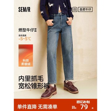 (免運)森柔牛仔|商場同款森馬牛仔褲女抓毛長褲2024新款冬季寬松錐形褲