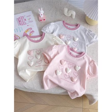 女童立體愛心短袖T恤洋氣甜美印花泡泡袖上衣女孩夏季新款打底衫