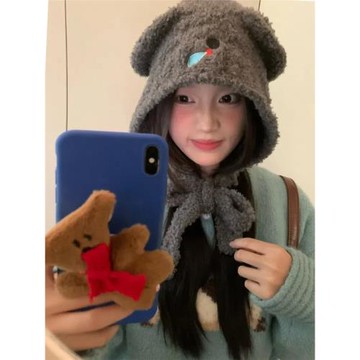 可愛考拉毛絨針織毛線帽子女秋冬季保暖護耳套頭帽綁帶顯臉小加厚