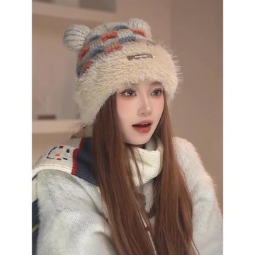 可愛拼色小熊耳朵針織帽子女冬季防寒保暖顯臉小加絨護耳毛線帽潮